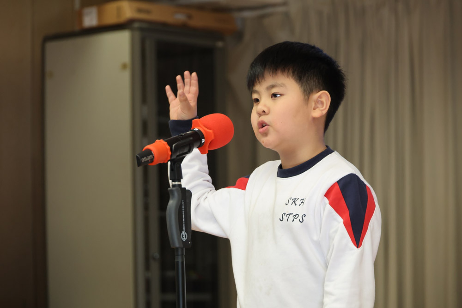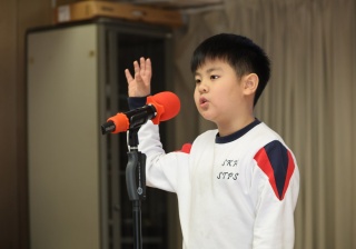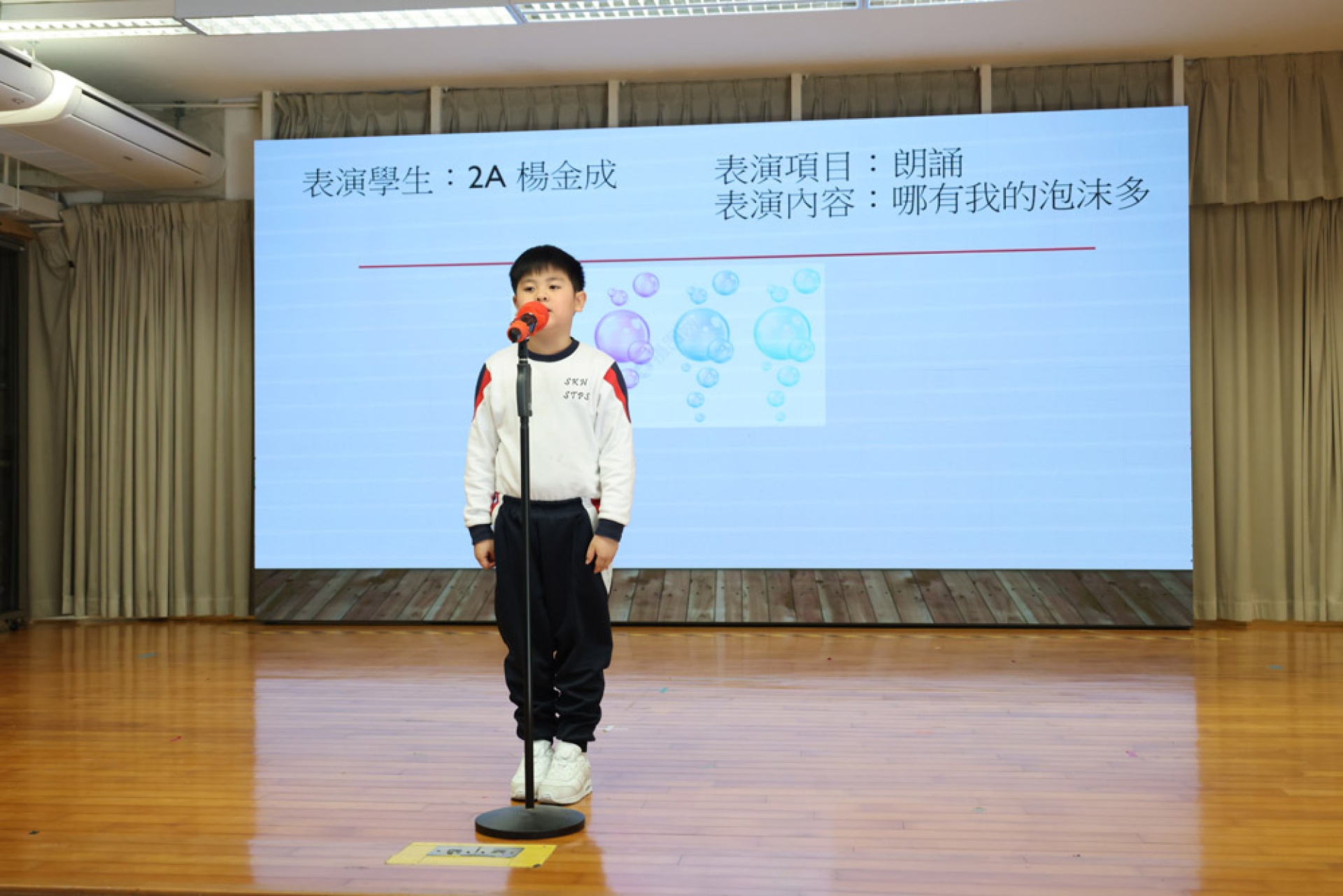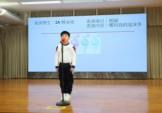 2A班的楊金成同學將帶來童趣十足的朗誦。他用清脆悅耳的聲音,生動演繹魚池中泡沫的情景。透過豐富的面部表情與自然的肢體語言,他將詩歌中那種情意表現得淋漓盡致,彷彿帶領觀眾進入了一個充滿繽紛泡泡的夢幻世界。