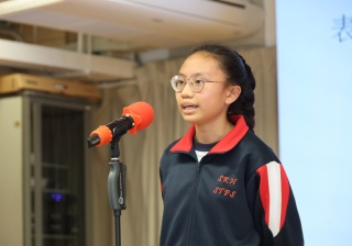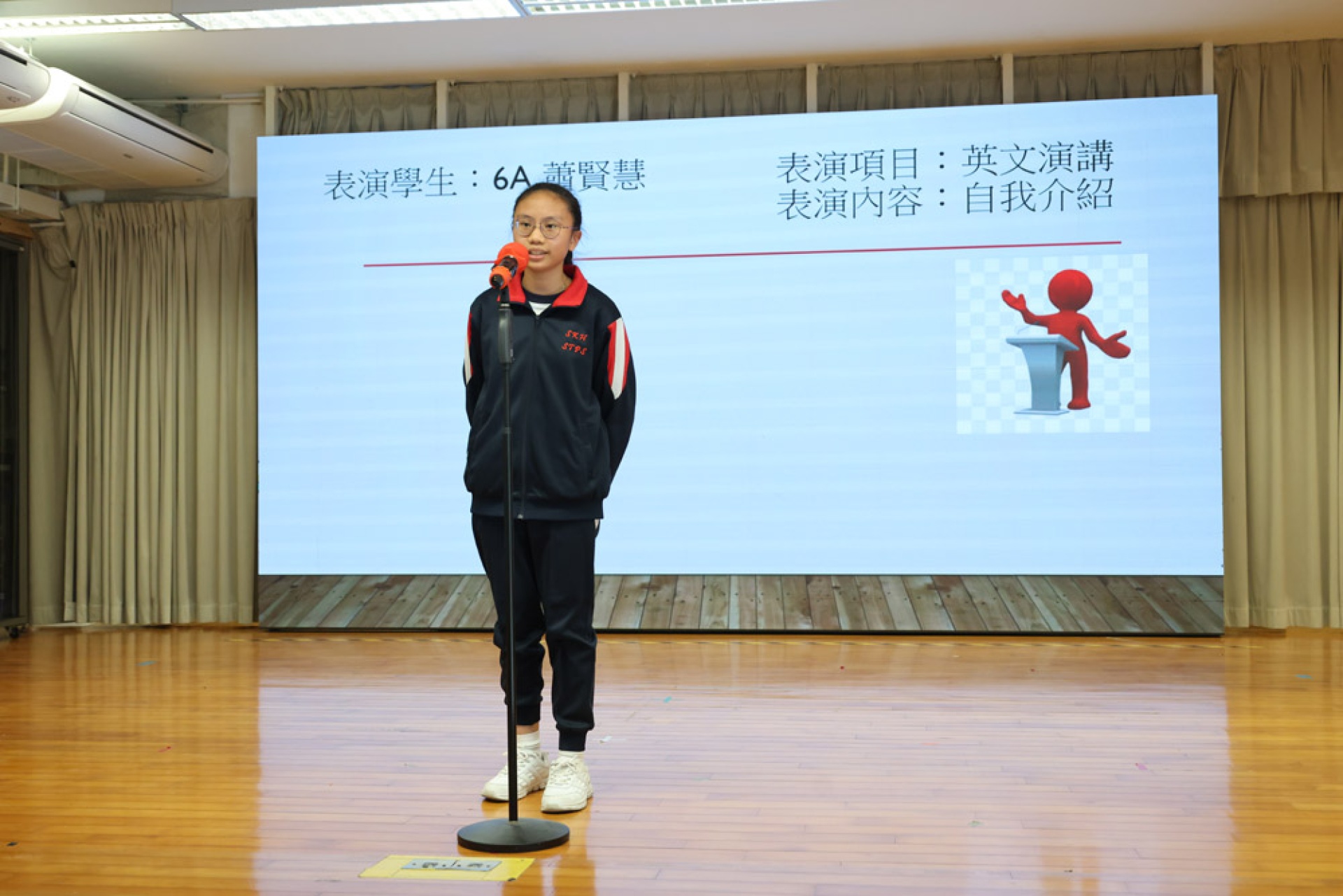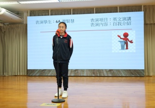 6A班的蕭賢慧同學以流利的英語進行自我介紹,展現即將畢業學姐的自信風采。她清晰地分享自己的興趣與夢想,並透過真誠的神情與台下觀眾交流。這不僅是一場語言能力的展示,更是一場關於自我成長的精彩自白,令人印象深刻。