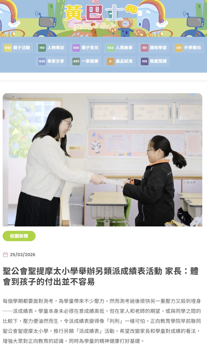 媒體報導《黃巴士》聖公會聖提摩太小學舉辦另類派成績表活動 家長:體會到孩子的付出並不容易