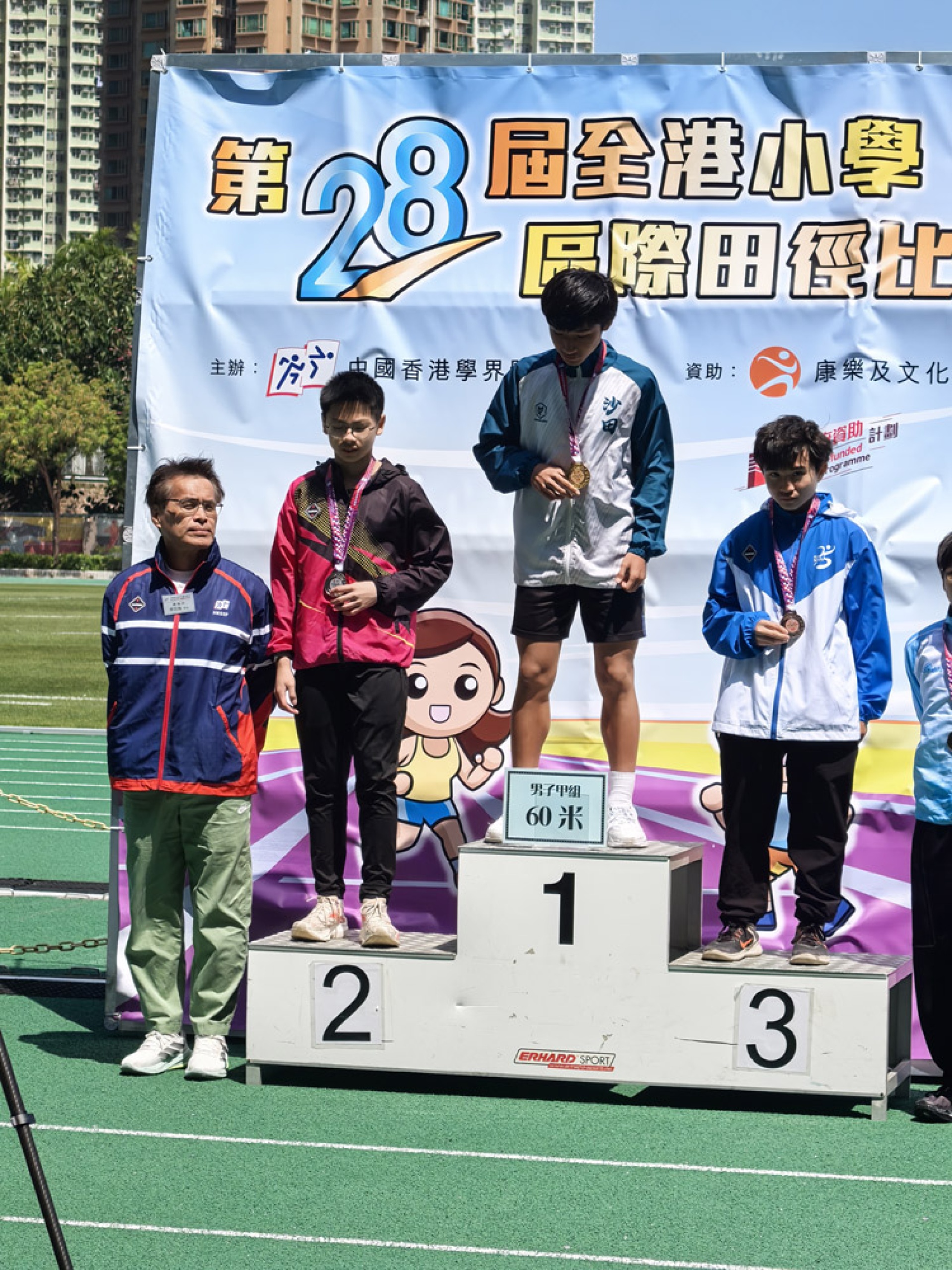 6A班周俊安同學於「第28屆全港小學區際田徑比賽」勇奪男子甲組60米季軍。俊安憑藉勤奮訓練與堅毅意志,為校爭光,展現本校推動全人發展的成果。全校師生同感驕傲,祝願他再接再厲,再創佳績!