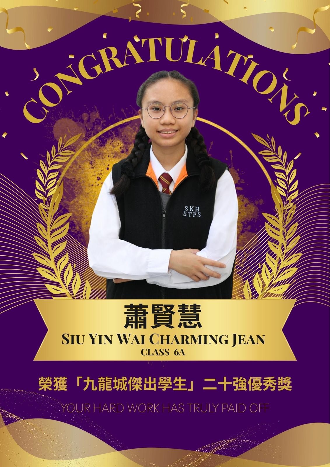 【提摩太喜訊分享】6A蕭賢慧同學榮獲「九龍城傑出學生」20強優秀獎!