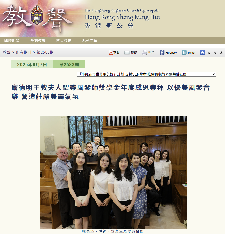 龐德明主教夫人聖樂風琴師獎學金年度感恩崇拜 以優美風琴音樂 營造莊嚴美麗氣氛