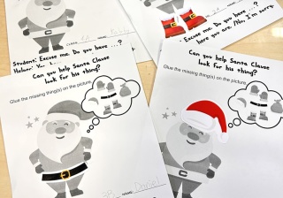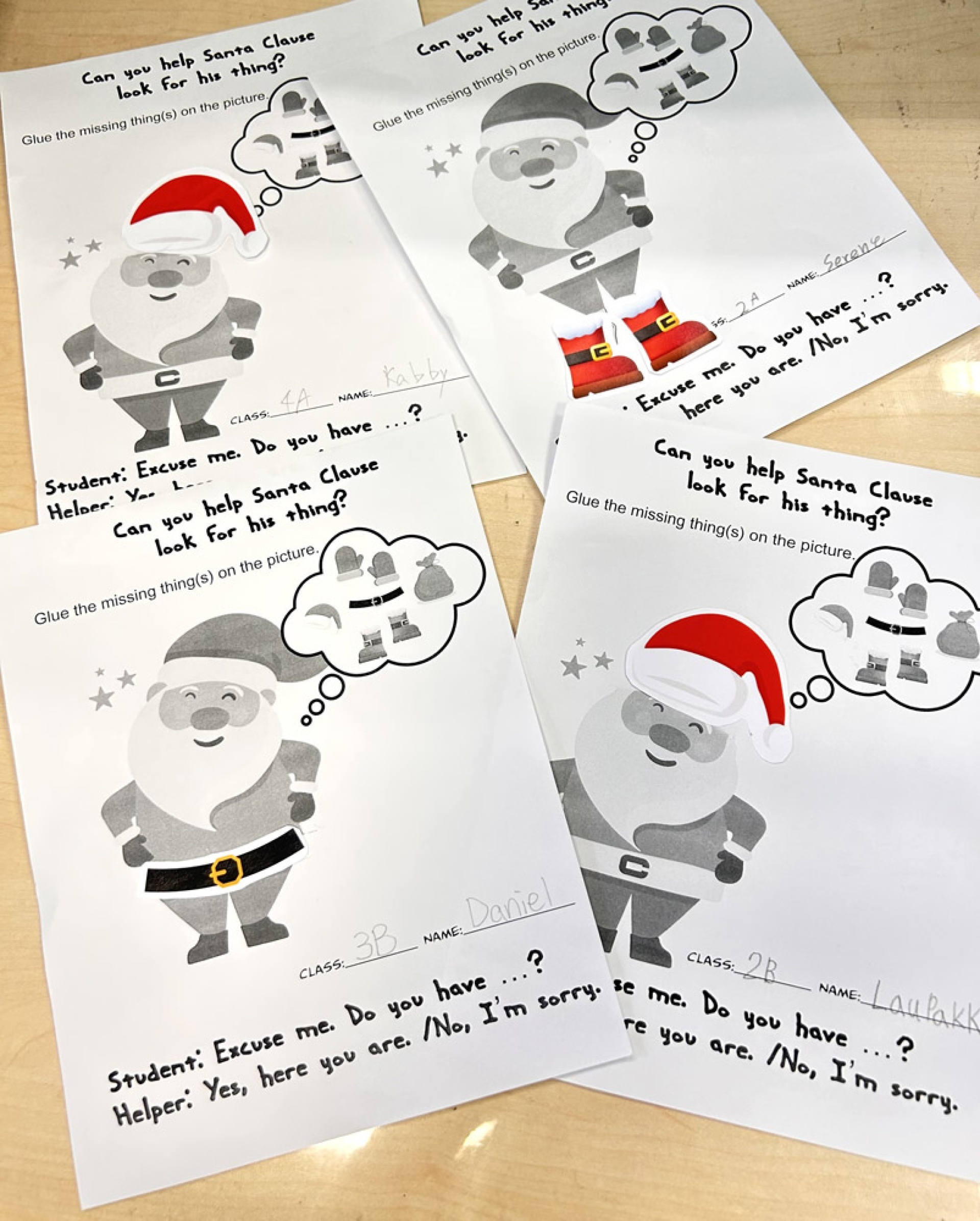 In the game, students used their observation skills and insight to look closely at the worksheet and identify which items Santa had lost. After discovering the missing object, they approached our English Ambassadors and used simple English to ask for Santa’s lost item.